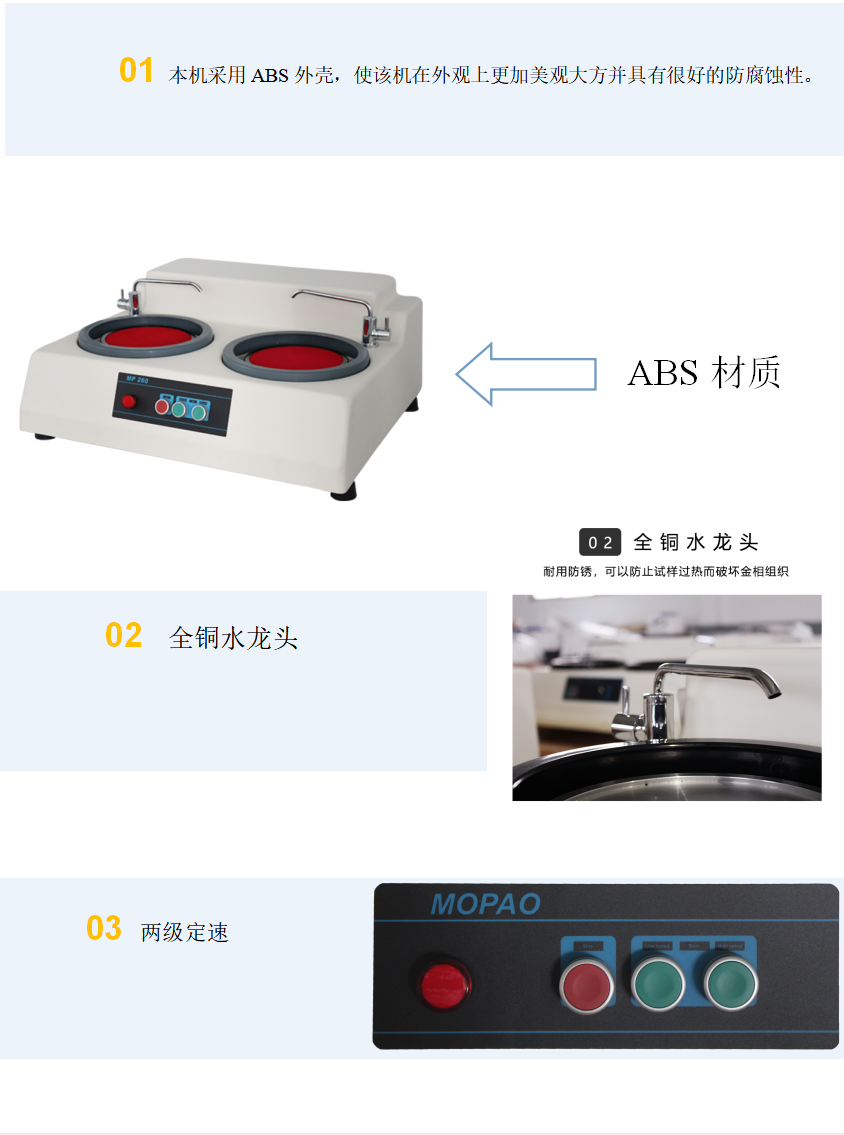 MP-260型磨拋機為雙盤臺式機,適用于對金相試樣進行粗磨、精磨和拋光操作。