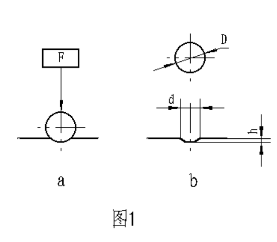 金屬布氏硬度試驗(yàn)系采用一定直徑硬質(zhì)合金球,以規(guī)定試驗(yàn)力壓入被測材料表面(圖1a)按規(guī)定保持時(shí)間后,卸除試驗(yàn)力,(圖1b)測量試樣表面的壓痕直徑,以計(jì)算出布氏硬度,并以下式計(jì)算之: